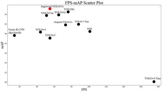 - As Figure 11 shows, the improved fusion algorithm in this paper outperforms the mAP of the latest YOLO series of algorithms such as YOLOXs, YOLOv6s, and YOLOv7-Tiny. Moreover, there is a little difference in terms of speed. This shows that the improved algorithm in this paper is still competitive even when compared to the latest algorithms.