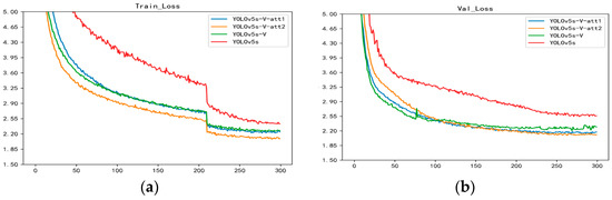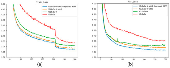 - Improvements to the backbone network resulted in a 1.24% improvement in mAP and an increase in the model size of only 2.4 MB. Adding either the attention mechanism or the Improved ASPP module alone, the attention mechanism works better than the Improved ASPP module because the attention mechanism can better assign weights to detection targets. The reason for the relatively small increase in the mAP of the improved ASPP module is that it duplicates the role of the SPP structure in the backbone network. Therefore, we chose to remove the SPP structure for experimental comparison. It can be seen that after removing the SPP module, YOLOv5s-V-att2 (No SPP) decreased by 0.55% compared to the previous mAP. YOLOv5s-V-Improved ASPP (No SPP) decreased by 0.32% compared to the previous mAP. This suggests that the improved ASPP module does duplicate the role of the SPP structure in the backbone. However, the combined comparison is still the improvement of the attention mechanism that improves the model accuracy more;