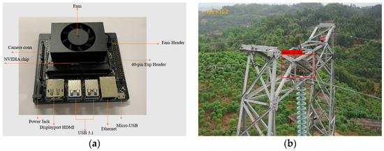 The embedded device port uses the Jetson Xavier NX, which has 384 CUDA cores, 48 Tensor cores, and 2 NVIDIA engines. It can run multiple modern neural networks in parallel, processing high-resolution data from multiple sensors simultaneously. It is suitable for use in drones, portable medical devices, and other systems. The Jetson Xavier NX is shown in Figure 14a, with real-time data acquisition by calling the hardware camera. The acquisition results are shown in Figure 14b, with an image resolution size of 1280 × 720, a detection speed of 10.2 FPS, and a confidence level of 0.82 in the detection of the bird nests.