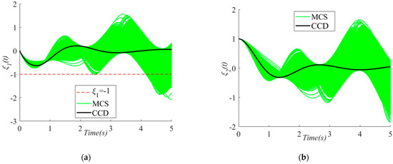 MCS plots of state variables in the solution of CCD: (a) , (b) .
