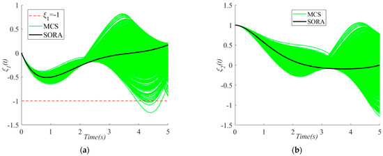 MCS plots of state variables in the solution of SORA: (a) , (b) .