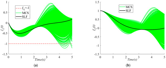 MCS plots of state variables in the solution of SLF: (a) , (b) .
