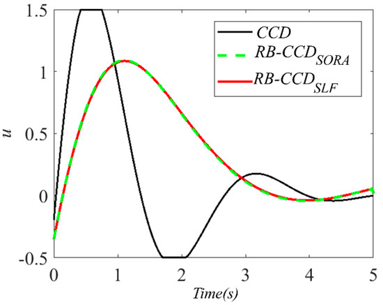 In attempting to graphically display the results of the MCS for the state trajectories of the solutions of the CCD and RB-CCD methods, 1000 samples are used to create the MCS plots in Figure 2, Figure 3 and Figure 4. Obviously, in Figure 2, a large number of trajectories of violate the inequality constraint, while only a small number of ones in Figure 3 and Figure 4 violate the inequality constraint. Meanwhile, the optimal control curves for the CCD and RB-CCD solutions are also plotted in Figure 5.