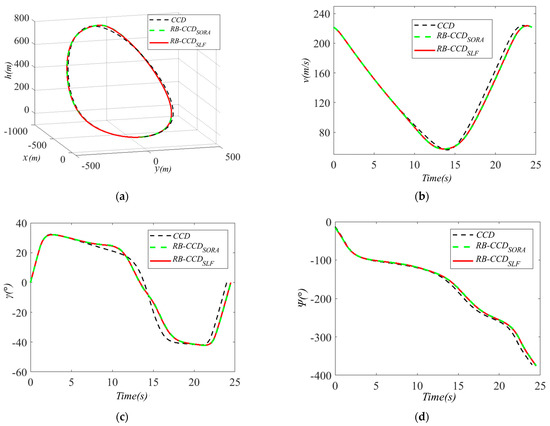 The optimal state trajectories in CCD of the glider dynamic soaring system: (a) , (b) , (c) , (d) .