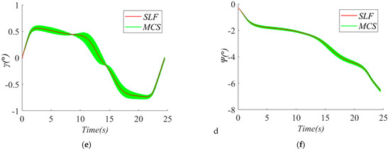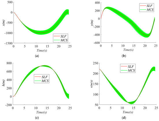 To intuitively demonstrate the optimal state trajectories and control curves of the RB-CCD problem for the glider dynamic soaring system solved by the SORA method and the single-loop framework, Figure 9 shows the trajectories of all state variables, and Figure 10 exhibits the curves of all control inputs. Finally, 1000 samples are used to create the MCS plots in Figure 11 to illustrate the MCS of the state trajectories in the solution of the single-loop framework. It can be observed that under uncertainty, states trajectories yielded by MCS of the system tend to deviate from the optimal states trajectories.