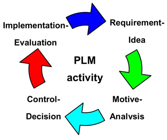 How to effectively combine these resources into a system? The answer must be sought by analyzing other complex systems. The most important principle of systems theory is the principle of isomorphism of regularities of systems []. According to this principle, a PLM system, as a complex system, must have regularities of complex systems such as emergence, integrativity, “requisite variety”, hierarchy, historicity, non-linearity, self-organization, two-phase evolution, adaptation, feedbacks (negative and positive or “damping” and “amplification”), self-similarity, openness, additivity and progressive factorization, memory, and must also have a structure similar to them []. Unfortunately, when developing PLM systems, this important principle is not often paid attention to [,]. Partially, these regularities are used in systems engineering [] and systems analysis [] techniques. In particular, the regularities of emergence, historicity, “requisite variety” and spontaneous order are noticeable in the systems analysis method of “gradual formalization of the decision-making model” []. The authors of the method note that most of projects of complex systems need to be described by a class of self-organizing systems; the models of which must be constantly adjusted and developed. The product life cycle should be isomorphic to the life cycle of other complex systems. The paper [] shows its correspondence to the activity cycle. Methodologists point out the importance of studying the phenomenon of activity: “activity is the only thing that exists from the very beginning, and nature is a certain construction of activity itself” []. Figure 1 shows the main stages of activities related to PLM [].
