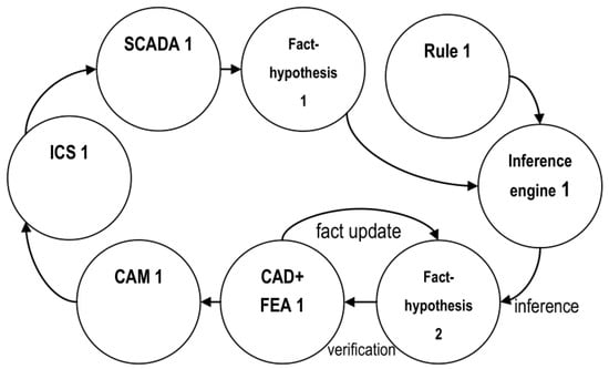 A simple example of a multi-agent PLM system is shown in Figure 2. Agents can implement knowledge base facts (facts, product requirements, and hypotheses for its improvement), inference rules, inference engine, CAD, FEA, CAM, and SCADA components, etc. Hypotheses and rules can be passed to the inference engine for analysis or to obtain new hypotheses, and they are then passed to the “CAD + FEA1” agent for verification by a finite element analysis (FEA) of the performability of the product model. If the analysis results confirm the hypothesis, the data are transferred to the “CAM1” agent to prepare the technological process for the product manufacturing. Otherwise, the hypothesis is not confirmed, and so the relevant facts are updated. Agent “ICS1” (Industrial Control System) manages the manufacturing process. The finished product is subjected to testing or operation, during which the “SCADA1” (Supervisory Control and Data Acquisition) agent monitors the technical condition of the product. Based on the results from monitoring, new requirements and hypotheses may appear, initiating a new turn of the helix. At any stage of the life cycle, it should be possible to interrupt the cycle and return to the previous stages.