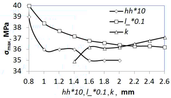 Dependences of the maximum equivalent stresses σmax in the connection on radial clearance in the thread (hh), thread length (l_), and pitch (k).