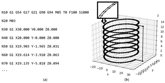 The CAM [] actor class agent uses the CNC_thread_mill.py [] module developed by the authors to generate the G-code for thread milling on a three-axis CNC milling machine (Figure 6a). The rule() function takes the value of the connection parameter and returns the corresponding list of G-code points (Figure 6b). The milling of taper external and internal threads with multiple passes and an arbitrary thread profile specified by the point coordinates in the X-Z plane is supported.
