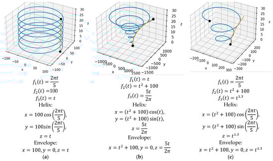 The helixPoints2() function has also been developed, which also returns helix points, but allows the user to build more complex and varied helixes. The function uses the SymPy symbolic mathematics package and the transformations (1). However, the user can easily modify its code to apply additional transformations. If the user defines different functions , , and , this allows different helixes to be obtained. Some of these helixes are shown in Figure 7. Along with helixes, their planar envelope curves obtained using SymPy are shown. Figure 7a shows a cylindrical helix with a radius of 100 and a pitch of 5; in Figure 7b the helix has a parabolic envelope, an initial radius of 100 and a pitch of 5; in Figure 7c the helix is different in that it has a variable pitch.