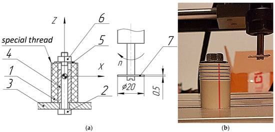 Technological sketch (a) and photograph (b) of milling a special thread on a CNC 3018 Pro machine.