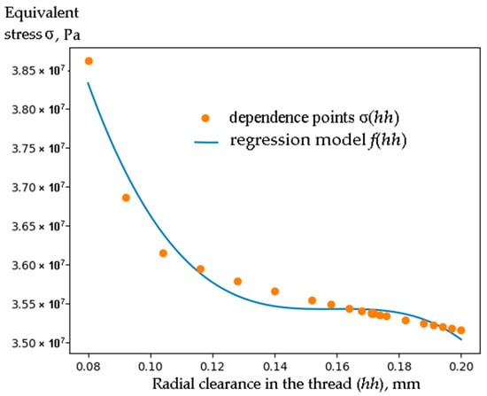 To demonstrate the operation of the module, the dependences of the maximum equivalent stresses in a threaded connection on parameters such as thread length, pitch, and clearance were obtained (Figure 5). However, the maximum stress in a joint is not always a criterion for its durability, so it is necessary to find the stress value in the most dangerous zones where fatigue cracks may appear, for example, in the zone of the first thread root. In many cases, such dependencies can be easily formalized, included automatically [], and the knowledge base facts can be obtained. For example, from the dependence σmax(l_) (Figure 5), one can observe the fact that: “an increase in the length of the thread leads to a decrease in the maximum stresses”.