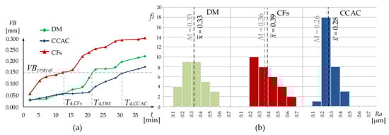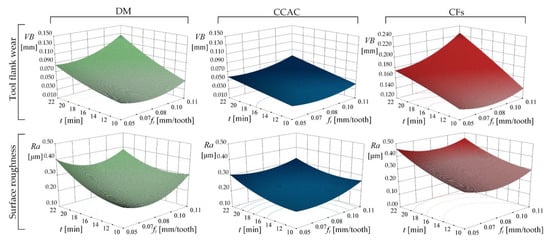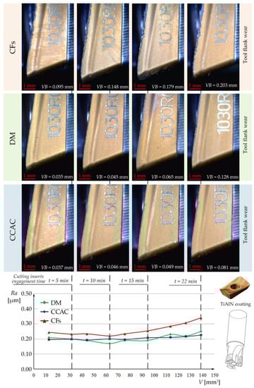 - The lowest average tool flank wear of 0.05 mm was achieved when hard milling under CCAC cutting conditions, followed by DM with an average VB value of 0.08 mm and CFs with an average VB value of 0.17 mm.