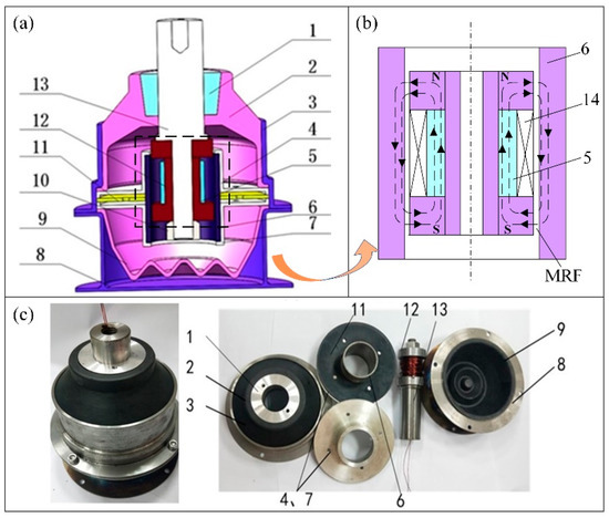 (a) Schematic diagram of magnetorheological suspension (b) magnetic circuit of magnetorheological suspension (c) physical map. 1 Reinforcing block; 2 rubber main spring; 3 upper cover; 4 upper piston chuck; 5 permanent magnet ring; 6 piston sleeve; 7 lower piston chuck; 8 lower cover; 9 rubber bottom film; 10 nuts; 11 decoupling film; 12 piston; 13 shafts; 14 coil.