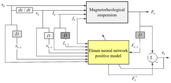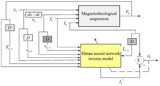 When establishing the non-parametric inverse model of magnetorheological suspension, it is also necessary to normalize the original data of the dynamics experiment first, and then determine the input and output variables of the Elman inverse model [26,27]. The input variable of the inverse model is the displacement x at the previous time k−1, current Ik−1, excitation frequency fk−1, damping force Fk−1, velocity vk−1. Additionally, the current speed vk, displacement xk, excitation frequency fk, damping force Fk, control current Ik required by the current working state of the suspension is the output of the network, D represents the delay unit sampling time, and the identification block diagram is shown in Figure 7.