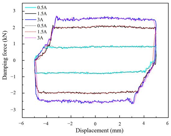 When the excitation frequency is 15 Hz and the amplitude is 5 mm, currents of 0.5 A, 1.5 A, and 3 A are applied, respectively. The relationship between damping force and displacement of the magnetorheological suspension obtained by the test, and the predicted results of the Elman neural network positive model is shown in Figure 6, where the thick solid line represents the experimental results, and the thin dotted line represents the predicted results of the model. As can be seen from the figure, the identification results of the Elman neural network positive model are consistent with the experimental data trend of the dynamic characteristics of the magnetorheological suspension, indicating that the positive model has a high identification accuracy. According to Equation (4), the prediction accuracy of the forward model of the neural network for the suspension damping force can be calculated, as shown in Table 1.