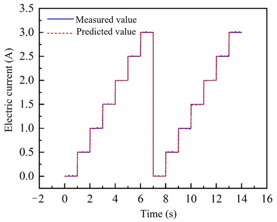 Taking the excitation frequency of 15 Hz and the amplitude of 5 mm as an example, the experimental results of the excitation current required by the magnetorheological suspension and the predicted results of the Elman neural network inverse model are shown in Figure 8. Where the thick solid line represents the experimental results, and the thin dotted line represents the predicted results of the model. It can be seen that the current identified by the Elman neural network inverse model is in good agreement with the current applied in the experiment of the dynamic characteristics of the magnetorheological suspension. This inverse model lays a foundation for the semi-active control of the magnetorheological suspension. Table 2 shows the relative approximation accuracy of the inverse model for magnetorheological suspension. It can be seen that the lowest approximation accuracy of the inverse model of the Elman neural network is 97.18%, indicating that the inverse model of magnetorheological suspension based on the Elman neural network meets the engineering needs.