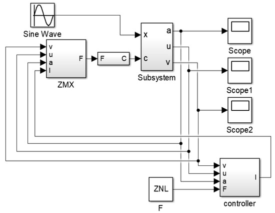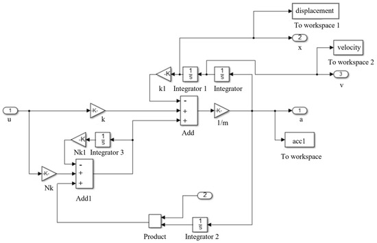According to the dynamic equation of the engine mounting system, MATLAB/Simulink module is used to establish the simulation model of a single-degree-of-freedom engine mounting system, as shown in Figure 10 and Figure 11.