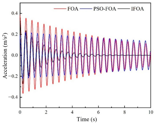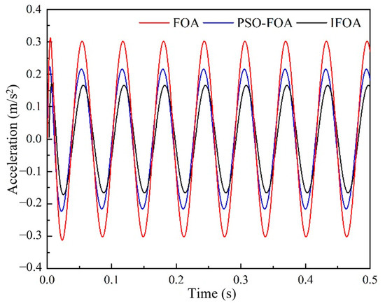 In order to verify the effectiveness of vibration control of IFOA PID controller, vibration control simulation was carried out by using the established single degree of freedom engine mount simulation model. The stiffness of the magnetorheological suspension is set as 165,000 N/m, the variable damping range is 400~2500 Ns/m, the value of N is 3, and the weight of the powertrain is 210 kg. Since the engine adopts three-point suspension, the weight of the powertrain borne by a single suspension is 70 kg. In order to simulate the vibration of the engine, so the input excitation of the simulation model is simple harmonic vibration, the excitation frequency is 29.7 Hz, i.e., idle speed n = 890 r/min, frequency is 99 Hz, i.e., speed n = 2980 r/min of the system were, respectively, carried out PID control simulation. The changes in body acceleration and displacement under PID control based on FOA, PSO-FOA (particle swarm optimization–fruit fly optimization algorithm), and IFOA are compared in Figure 12.