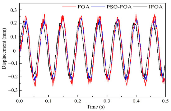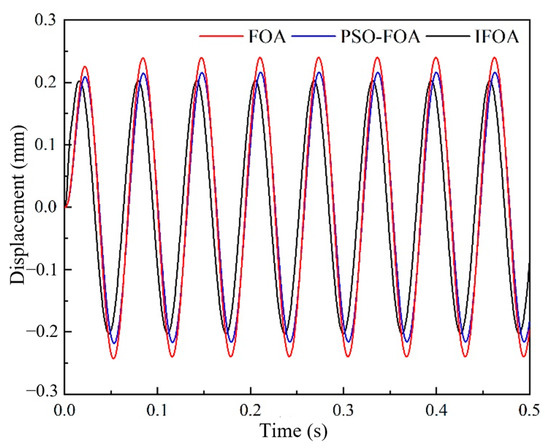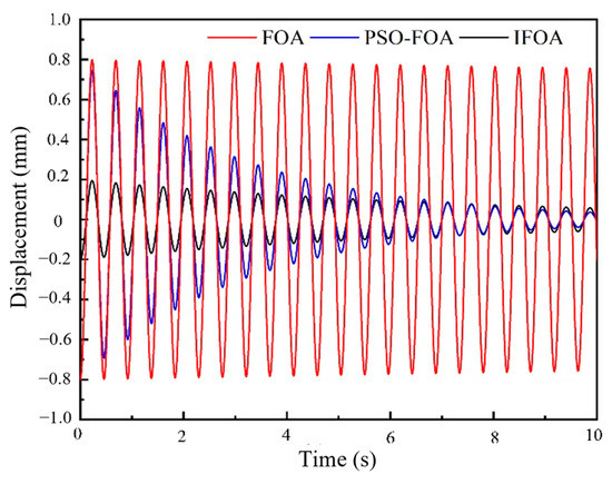 Figure 12, Figure 13, Figure 14 and Figure 15 show the acceleration and displacement response of the vehicle body under simple harmonic vibration. Figure 12 and Figure 13 show the acceleration and displacement response of the vehicle body when engine speed n = 890 r/min, respectively. Through comparative analysis of simulation data, it can be found that compared with the other two controllers, the acceleration and displacement peaks obtained by the IFOA method are the smallest. The stability time is the shortest and the vibration acceleration of the body is finally close to zero. Figure 14 shows the acceleration response of the body when the engine speed n = 2980 r/min. It can be seen that, based on FOA, the amplitude-of-PID control of the PSO-FOA algorithm is larger than that of the PID control optimized by the IFOA algorithm, among which FOA has the worst control effect and the peak acceleration is 0.32 m/s2. The acceleration amplitude controlled by the PSO-FOA algorithm is followed by that controlled by the IFOA algorithm, and the acceleration amplitude controlled by the IFOA algorithm is the best, which is 0.16 m/s2. Figure 15 shows the body displacement response when engine speed n = 2980 r/min. The peak-to-peak value of body vibration displacement controlled by the IFOA algorithm decreases by 19.05% and 38.9%, respectively, compared with that of the original FOA and PSO-FOA. Compared with the PID controllers of FOA and PSO-FOA, the PID controller optimized by the IFOA algorithm has better control performance, and the vibration isolation effect of the engine at idle speed and high speed is satisfactory. Due to the limitation of the characteristics of the magnetorheological suspension, it is difficult to achieve the goal of zero vibration displacement of the frame at present.