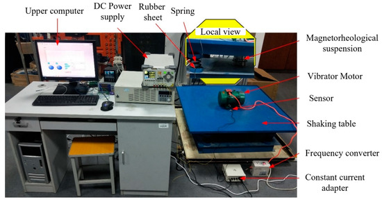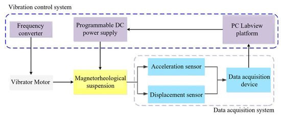 In order to test the vibration-damping performance of the magnetorheological suspension system, the schematic diagram of the experimental platform built is shown in Figure 16. The experimental system includes a vibration motor, frequency converter, data acquisition system, and vibration control system. The vibration motor is used to simulate the vibration of the engine itself, and the frequency converter can adjust the speed of the vibration motor to simulate different working states of the engine. The data acquisition system is composed of acceleration, displacement sensor, data acquisition card, etc., which is used to collect, store, and transmit the vibration signal of the test platform. The vibration control system, as the core part of the whole experiment system, is composed of a frequency converter, programmable DC power supply, and host unit. PC LabVIEW platform processes the data collected by the PCI data acquisition card and obtains the control signal of magnetorheological suspension through analysis, namely the excitation current signal required by magnetorheological suspension in the current working state, and sends it to the programmable DC power supply, which then acts on the magnetorheological suspension to realize the control of damping force. Figure 17 shows the experimental platform of the magnetorheological suspension control system.