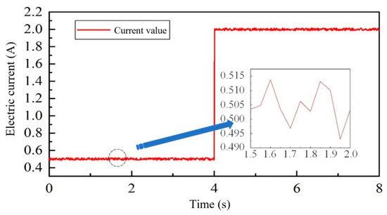 The output current commands of 0.5 A and 2 A are applied to the programmable current source through LabVIEW, respectively. The comprehensive results are shown in Figure 18. It can be seen that the DC power supply can complete the required output current command, so it can be seen that the communication between the DC power supply and the LabVIEW current control module is intact, but there is some error in the output current. Through the analysis of the experimental data of 0.5 A current, the average deviation of the output current is 7.543 × 10−0.3, and the relative average deviation is 1.5088%. The peak-to-peak value of the error is 0.0138 A, and the current output is within a reasonable range.