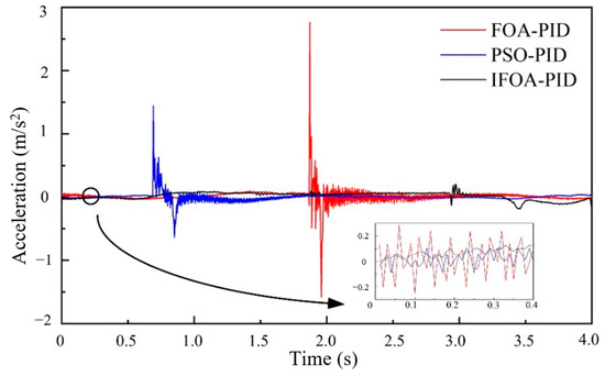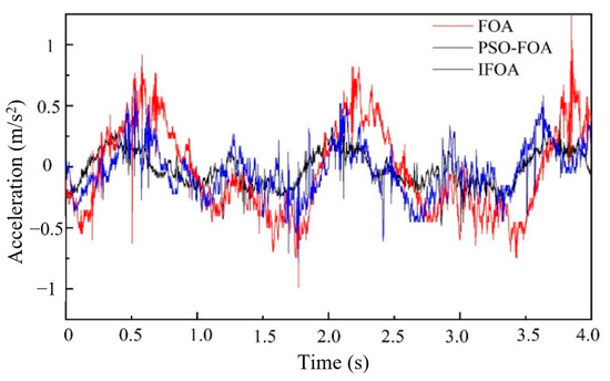 Under different control algorithms, the variation curve of the performance index of the engine mounting system is shown in Figure 19, Figure 20, Figure 21 and Figure 22. It can be seen that the peak value of displacement and acceleration of the mounting system controlled by the IFOA PID algorithm is the smallest compared with that controlled by the other two algorithms, indicating that the IFOA PID control algorithm has a better control effect. As shown in Figure 21, the high-frequency acceleration of the suspension system controlled by FOA has a large amplitude oscillation at 1.8 s~2.2 s, and the same oscillation also exists in the suspension system controlled by PSO-FOA within 1.5 s~1 s. The reason is that the vibration motor resonates with other parts in a short time during the vibration process of the suspension system. However, the amplitude controlled by PSO-FOA decreases a lot relatively, while the high-frequency acceleration controlled by FOA does not have instantaneous oscillation of large amplitude, which indicates that the control effect of FOA PID is better.