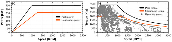 TM4 SUMO HD HV3500-9P performance characteristics: (a) power–speed curve and (b) torque–speed curve.