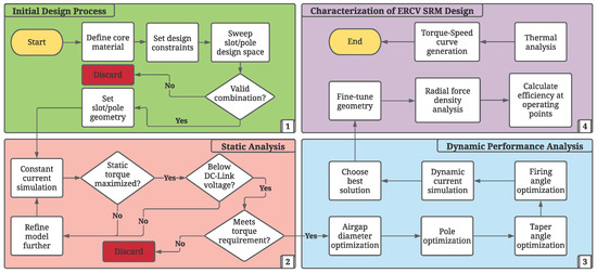 The design of the ERCV switched reluctance motor is conducted in four stages, as depicted in Figure 2. It is worth mentioning that the design process does not strictly follow a linear path; certain steps can be repeated multiple times in an iterative loop until the desired results are obtained [23,24].