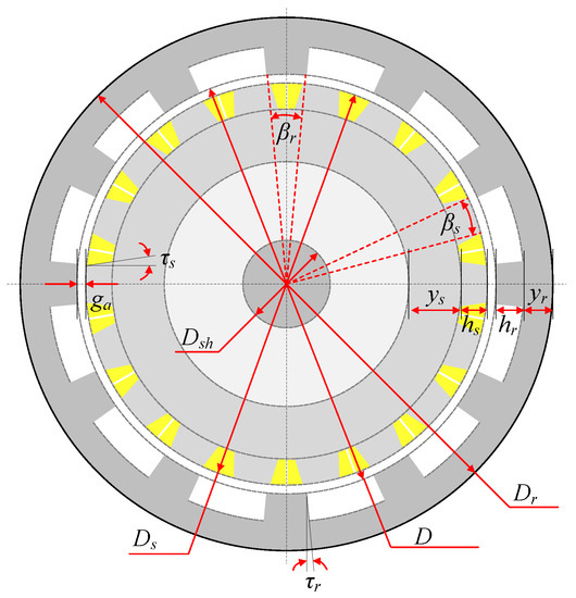 where is the number of rotor poles, and are the stator and rotor pole arc angles, and m is the number of phases. The mechanical dimensions of an example outer rotor SRM are shown in Figure 3. Six possible configurations that met the constraints were identified: 18/12, 18/24, 18/30, 18/42, 36/24, and 54/36. Initial mechanical dimensions for these configurations can be proposed based on the SRM design constraints shown in Table 3 while meeting the aforementioned constraints.