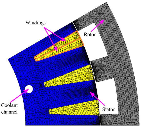 For the static and dynamic analyses, fractional motor models were developed and analyzed in JMAG, as shown in Figure 4. First, the static characteristics of suitable configurations were obtained and compared with the goal of maximizing torque while minimizing copper loss and induced voltage. To obtain such characteristics, sweeps of constant current in steps of 25 A were used, and mesh size was adjusted for the corresponding pole configuration as presented in [26].