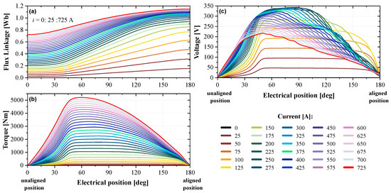 Static characteristics of the 36/24 SRM at 1000 RPM (i = 0:25:725 A): (a) flux linkage, (b) torque, and (c) voltage.