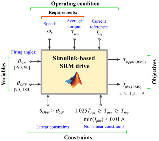 For the dynamic analysis, reference current and firing angle optimizations were carried out at different operating points. A genetic-algorithm (GA) multiobjective optimization was developed in MATLAB/Simulink as shown in Figure 6. This iterative optimization requires the designer to specify the mechanical speed () and the required average torque () under different values of current reference ().