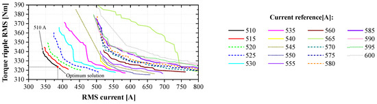 Equations (3) and (4) are required to calculate the dynamic average torque and RMS torque ripple, respectively [11]. In these expressions, is the instantaneous torque, and is equal to a complete electrical cycle of the SRM. Figure 7 shows the results for the RMS torque ripple calculated in the GA multiobjective optimization as a function of RMS phase current at different current reference values at the base speed. Each point on each curve achieves the required torque and has a specific value for both, and . Then, the selection of the optimum conduction angles is done by choosing the point with the lowest reference current, the lowest RMS current, and the lowest torque ripple RMS. Optimized values for , , and for 950 RPM are 510 A, −22.85, and 144.35, respectively. In the case of the maximum speed, these values are 305 A, −66.42, and 113.18, respectively.