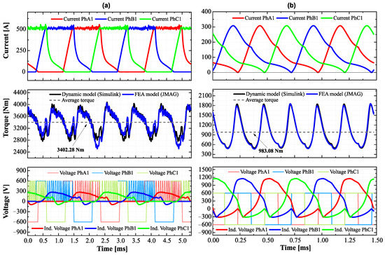 Figure 8a,b show the dynamic results for the 36/24 SRM at the base and maximum speeds, respectively. Please note that for the phase currents and phase voltages, one out of three three-phase sets is shown. The torque waveform is calculated for all three-phase sets combined. For both operating points, phase currents reach zero at the end of the conduction period. This enables lower current, especially at high-speed operation, to limit the copper losses. At 950 RPM, the hysteresis controller regulates the phase current at the reference value, A, as the induced voltage is lower than the DC-link voltage.