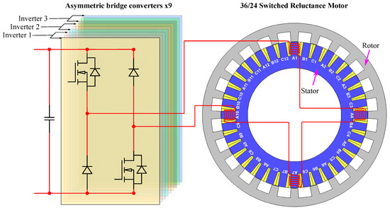 The final geometry and winding parameters for the 36/24 SRM are presented in Table 8 and Table 9, respectively. Figure 9 illustrates the block diagram of the proposed SRM drive and the active elements of the machine. The windings of only one of the nine phases are represented and connected to their corresponding asymmetric bridge converter.