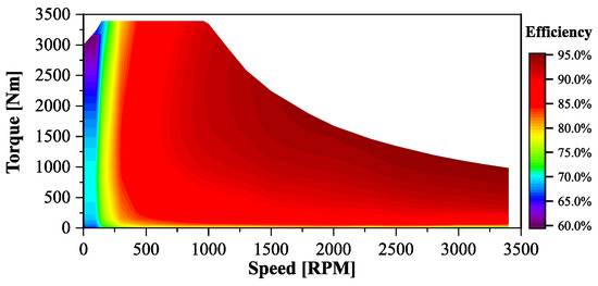 Statistical analysis of the vehicle’s torque–speed demand suggests that 87% of the operating points fall below the base speed of 950 RPM. This can be considered a particularly important region of operation for the motor. The analysis also reveals that 20% of the operating points are above the continuous torque, 2% are at the maximum torque, and ≪0.1% are above the continuous power rating of the machine.