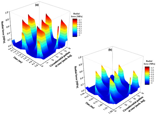 The study of vibration and acoustic noise is important for any electric machine. In the case of the designed SRM, vibration and acoustic noise are mainly caused by radial force density harmonics in the outer rotor [27,28]. The radial forces can be considered as a time moving force density composed by temporal and circumferential order harmonics. The electromagnetic force density waveform in the airgap is shown in Figure 11a for 950 RPM and in Figure 11b for 3400 RPM. Similar to the dynamic results depicted in Figure 8, these simulations were run for two electrical cycles (30 in circumferential position).