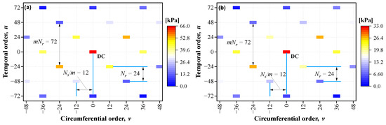 The radial force density waveform for 950 RPM is higher in magnitude, as the average torque is also higher than that produced at 3400 RPM. Next, the 2D FFT of the radial force density waveform is obtained to observe the magnitude of the different harmonic orders. The location of these harmonics in the u-v plane depends on the SRM pole configuration. In the case of the 36/24 SRM, the circumferential spacing between harmonics is given by , while the temporal spacing is defined as the number of strokes . The 36/24 SRM has twelve magnetic poles; therefore, the natural frequency of mode shape 12 is of particular importance. Figure 12a,b show the temporal and circumferential harmonic orders for the 36/24 SRM for 950 and 3400 RPM, respectively.