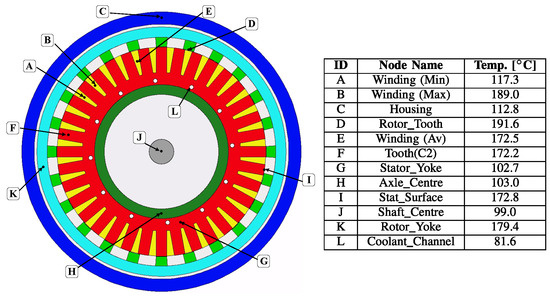 The selected cooling configuration is fundamentally based on TM4 patent US6819016B2 for the liquid cooling of outer rotor machines [29]. In this patent, TM4 proposes the use of copper tubes embedded in the stator back-iron to irrigate coolant flow. For the thermal analysis of the ERCV SRM, copper tubes have not been included. The use of copper tubes needs to be further investigated taking into consideration assembly, core material selection, and thermal management. The 36/24 ERCV SRM design is totally enclosed, and the outer housing is cooled via natural convection. Forced air flow over the housing can improve thermal performance considerably, which can further improve thermal management of the motor. However, forced air flow of the outer housing is not considered to achieve a conservative design. Figure 13 shows temperatures on the radial cross-section of the motor at 1260 RPM and continuous torque of 1970 Nm. The axial cross-section at 3400 RPM and continuous power 260 kW can be seen in Figure 14.