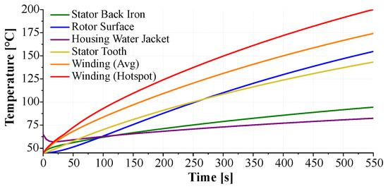 Winding and steel temperatures are below 200 C for both operating points, making type K magnet wire insulation class suitable for this application. Figure 15 shows the transient temperature characteristics for base speed operation at the maximum torque. For the ERCV SRM, this is the most severe loading condition. It can be seen that the winding temperature exceeds 200 C after 550 s. As the peak operating requirement is 30 s, it can be concluded that the peak operating requirements are met. The maximum observed coolant pressure drop is 110 kPa over all cases; this is within the requirements given in Table 2. This pressure value is calculated automatically in Motor-CAD based on the fluid properties, coolant channel geometry and properties, coolant temperature, and flow rate.