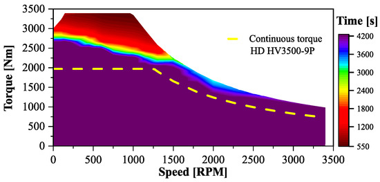 Figure 16 shows the transient overheating time for the full torque–speed curve for the 36/24 SRM. The designed ERCV SRM allows for a similar continuous torque operation to the HD HV3500-9P, with a transient overheating time greater than 4200 s.