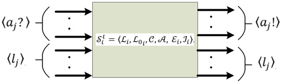 In Figure 1, are the sent synch messages from the module to other modules for triggering action. Similarly, are the received synch from the module to the module for triggering action. Some state transitions of the module may depend on the states of other modules as the parameters of the guard condition. Therefore, are the locations (states) of a module needed by another module.