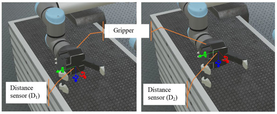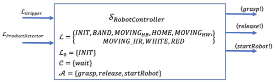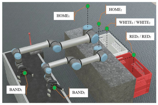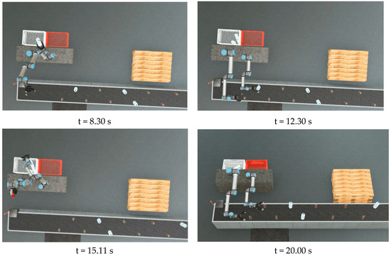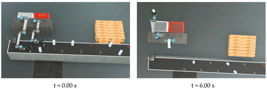 The simulation environment was constructed by using WEBOTS. Then, the robot program was run in the simulation environment. The products soda and water moved randomly on the conveyor band. During the execution, it was seen that the requirements were met. Figure 16 shows some snapshots from the simulations. The complete simulation video can be watched at the link https://youtu.be/V_Tpsp5NUA0 (accessed on 3 January 2023). At , the grippers mounted on the robot arms are over the conveyor band, and the products are coming through the grippers. Before , both robot arms hold a water bottle and move towards the white crate at almost the same time. Furthermore, at , robot R2 is waiting for R1 while robot R1 is dropping the bottle and returning to the position HOME. Then, at , the robot R2 also moves toward the white crate and drops the bottle. Similarly, at , R1 grabs a soda can while R2 grabs a water bottle. In this case, R1 waits at HOME until R2 returns HOME after dropping the water bottle into the white crate.
