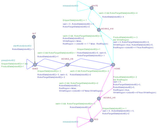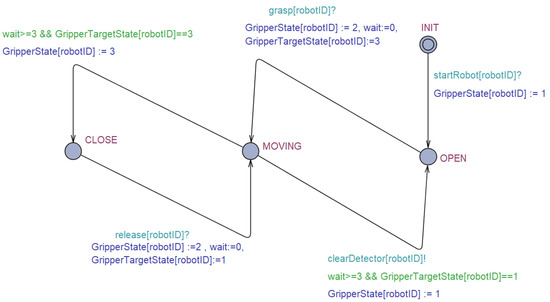 Some studies present architectures to implement V&V for robotic systems. Kanter and Vain [10] present a testing toolkit named TestIt. It provides tools for the automated model-based testing of autonomous multi-robot systems. They use UPPAAL (Ver.4.1.26-2) [11] for modeling and model checking. Wang et al. [12] present a model-based approach, which has the phases of modeling, verification, and automatic code generation. In their framework, UPPAAL is employed for verification, and the code generator produces ROS code. An industrial robot application of grasping a cup is used to demonstrate and evaluate the proposed framework.