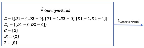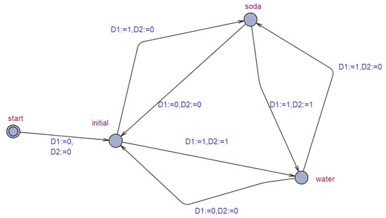 Timed automata were introduced as a formal notation to model the behavior of real-time systems [29,30]. This formalism provides labeled state-transition graphs with timing constraints using real-valued clock variables. The state transition system is defined by a tuple , where is a set of states, is a set of initial states, is a set of labels (or events), and is a set of transitions. The system starts in an initial state, and any transitions between the states are written by for where and .