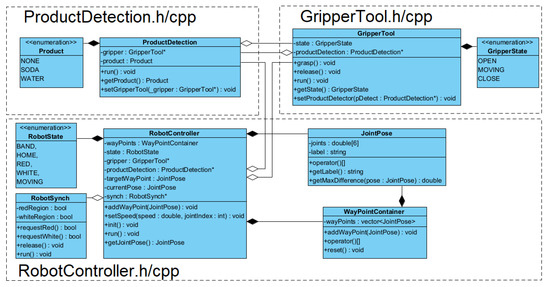 After the model of the system was verified by meeting the desired requirements, then the control software of the system could be developed to reflect the verified model. The object-oriented design approach was employed to implement the control software. The UML class diagram of the system is given in Figure 15. run() methods of each class implement the related state transition models, which are verified for meeting the requirements. The classes are coded in C++.