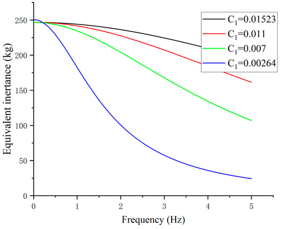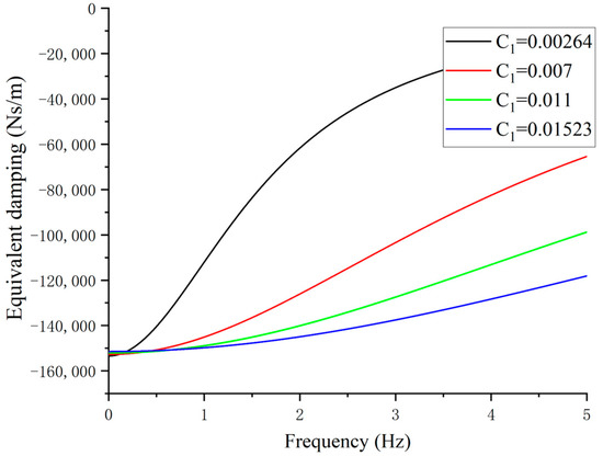 The Figure 3 shows that when the is set with its minimum value and varies in its controllable range, with the increasing of , the equivalent linear inertance of VEI–VD is increasing. When the damping is constant, the equivalent inertance decreases with the increase of . The frequency in the X-axis is . The reason is that, in the traditional inerter, the rotation of flywheel in the inerter will generate the inertance force, while in the proposed device, the flywheel is driven by the controllable damping torque, and the flywheel needs time to accelerate to a high velocity. When the frequency of the reciprocating rotation is high, the flywheel has not time to accelerate to a high velocity, thus, the equivalent inertance of the device is low. In addition, the equivalent linear damping of the VEI–VD device is determined by VEI and VD devices. Obviously, with the increase of the , the equivalent linear damping is increasing and the Figure 4 shows that the equivalent damping of the device is controllable with . Thus, the equivalent linear damping will also increase with the increase of the two dampers. The results of the simulation indicate that the inertance and damping of the VEI–VD device can be controlled by varying the magnitude of and .
