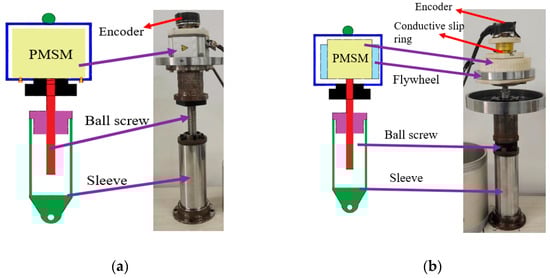 An electromagnetic VD device using a permanent magnet synchronous motor (PMSM) has been proposed in [30]. Due to the excellent controllability of the electromagnetic damping device (EMD) demonstrated in the experiments, the VEI–VD device adopts two identical PMSM (MSMD022G1S), and the inertial element of the VEI device is a flywheel. In the VEI device, the ball screw is connected to the shaft of the motor through a coupling, and the flywheel is attached to the shell of the PMSM. The flywheel rotates with the shell of the PMSM. The wire of the PMSM is led out through the conductive slip ring for its control. The prototype design is shown in Figure 5.