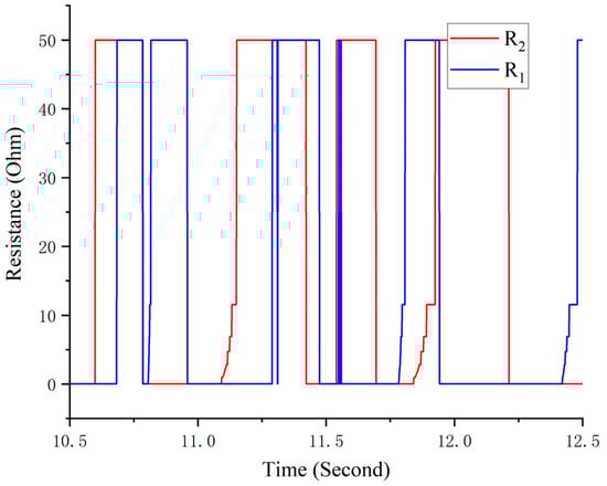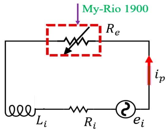 A real-time variable resistance circuit is designed to realize the function of the VD device [29], which is shown in the Figure 6. A three-phase rectifier is used to convert the three-phase electricity of PMSM into direct current. The PMSM and rectifier are equivalent to a voltage source , an internal resistor , and an internal inductor . The internal inductance is ignored to simplify the modelling [30] because the seat vibration energy is mainly at low frequency where the inductor can be treated as a conducting wire. At the same time, a controller (NI My-Rio 1900) is used to control the external resistance. Thus, the magnitude of resistors connected to the circuit can be controlled, achieving the purpose of controlling the resistance of the whole circuit.